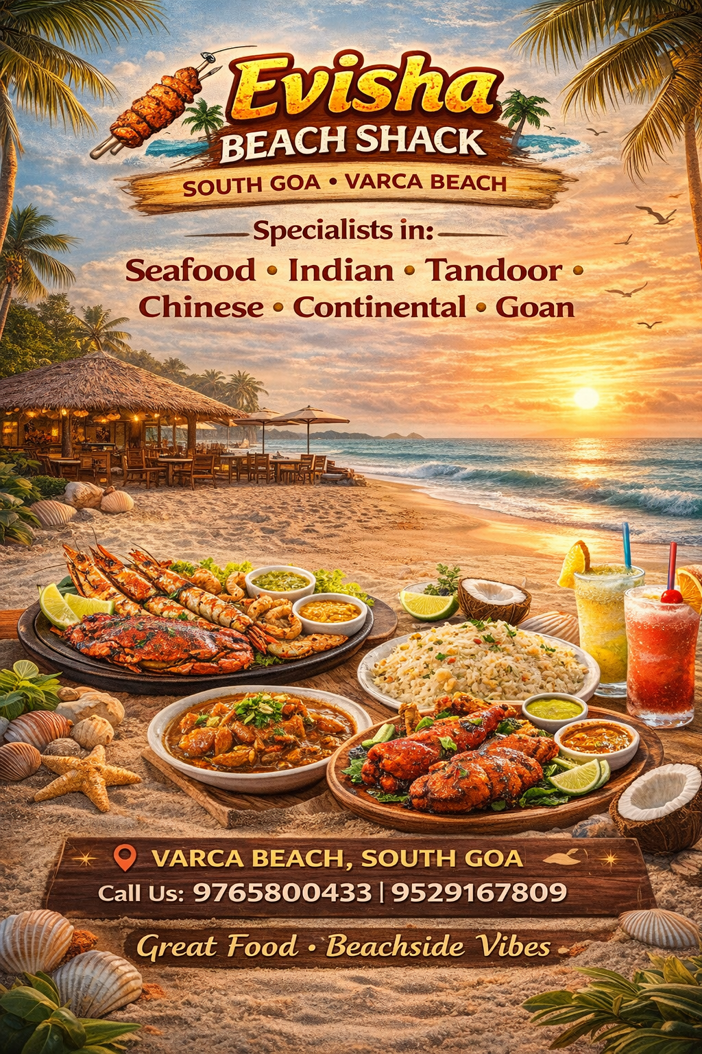Evisha Beach Shack in South Goa offers delicious seafood along with Indian, Goan, Chinese, Continental, and tandoor specialties. Located at Varca Beach, it is known for its relaxed beachside ambience, fresh ingredients, and flavourful dishes, making it a perfect spot to enjoy great food by the sea.