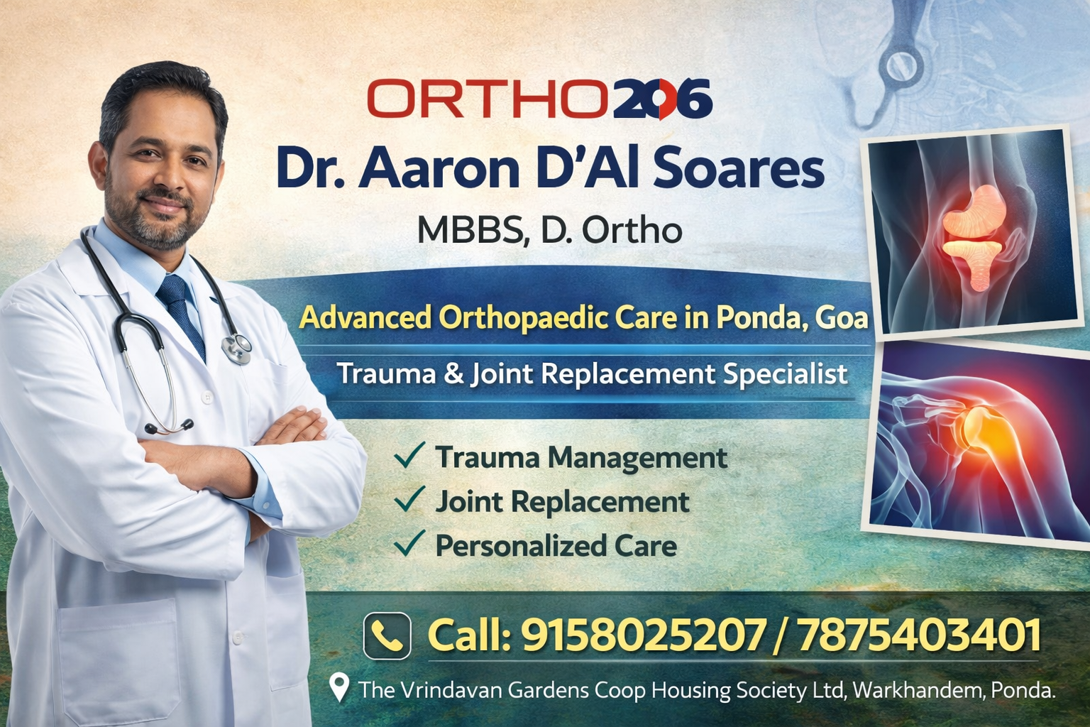 Ortho 206, led by Dr. Aaron D’Al Soares (MBBS, D.Ortho), offers advanced orthopaedic care in Ponda, Goa. Specializing in trauma management and joint replacement, the clinic provides personalized, precise treatment with modern techniques. Ortho 206 focuses on restoring mobility, relieving pain, and improving patients’ quality of life.