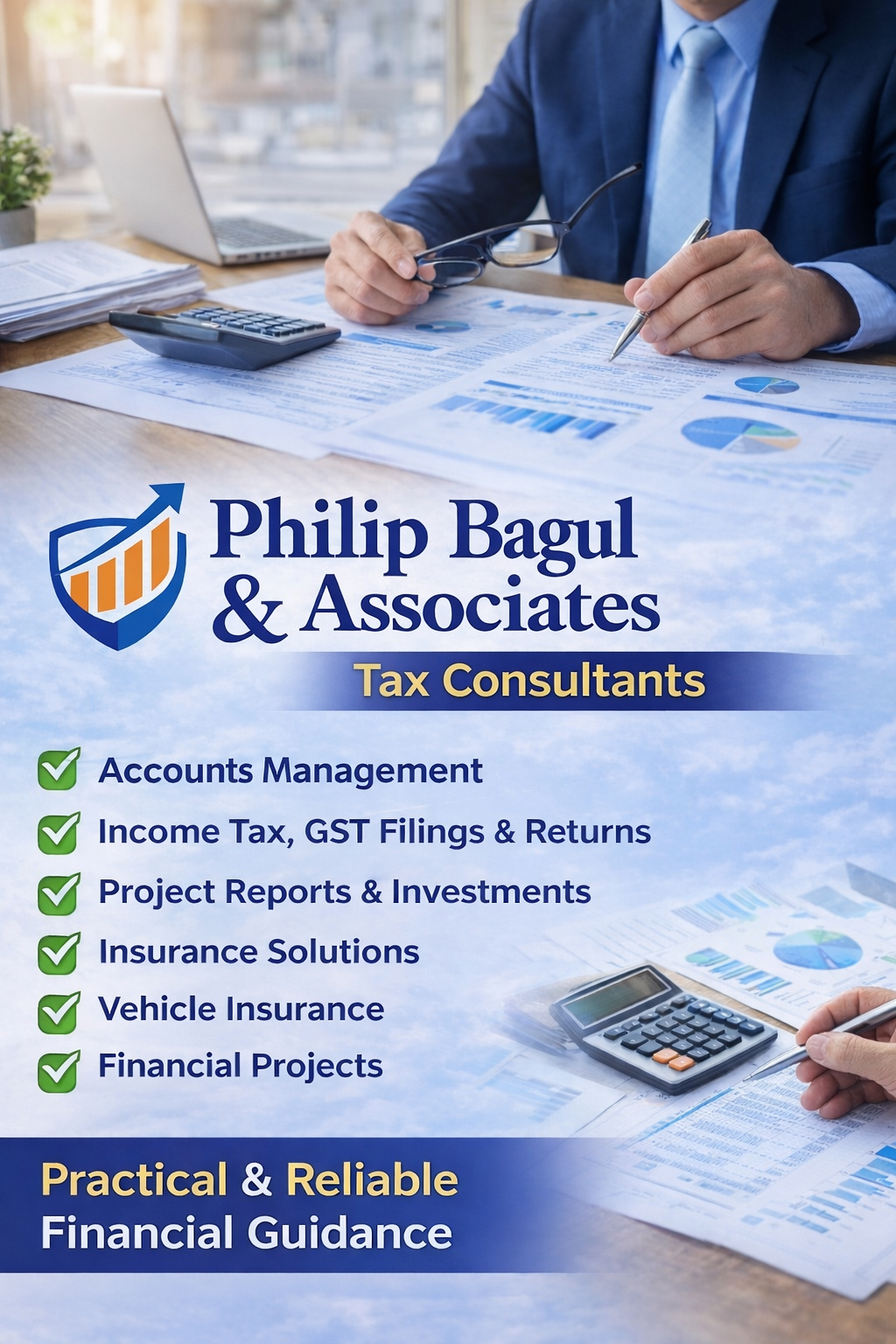 Philip Bagul & Associates offers reliable tax consultancy services including accounts management, income tax, GST filings and returns. The firm also handles project reports, investments, insurance solutions, vehicle insurance, and financial projects, providing practical and trustworthy financial guidance for individuals and businesses.