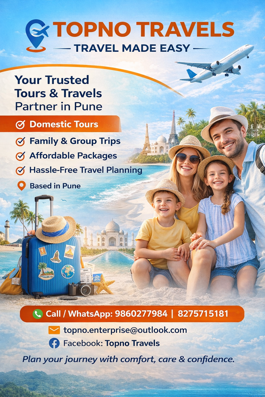 Topno Travels is a reliable tours and travels service based in Pune, offering customized travel solutions for individuals and groups. The company provides domestic travel planning, bookings, and customer-friendly services, ensuring comfortable, affordable, and hassle-free travel experiences for all customers.